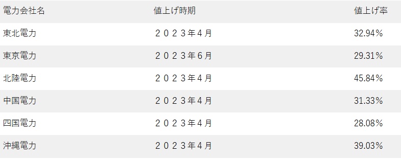 一般家庭で主に利用されている電気料金(低圧・規制部門)について、各電力会社の値上げ時期と値上げ率は次の通りです。