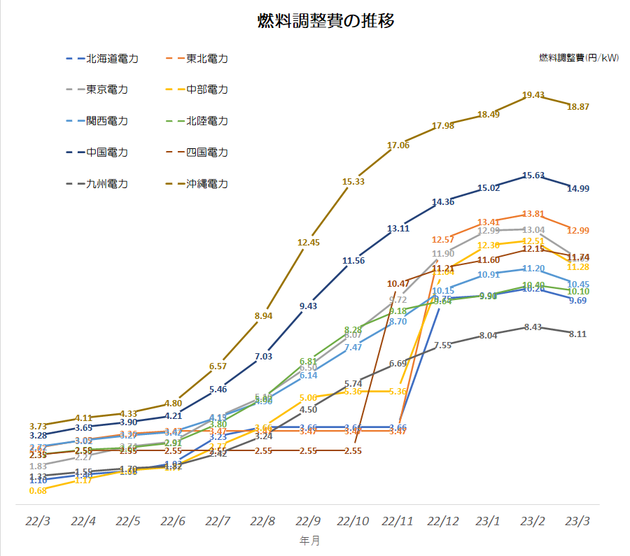 (参考)大手電力10社の燃料費調整額 単価の推移表(13ヶ月分)