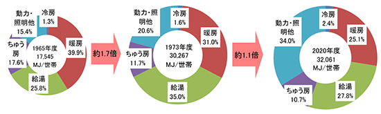 世帯当たりのエネルギー消費原単位と用途別エネルギー消費の推移
